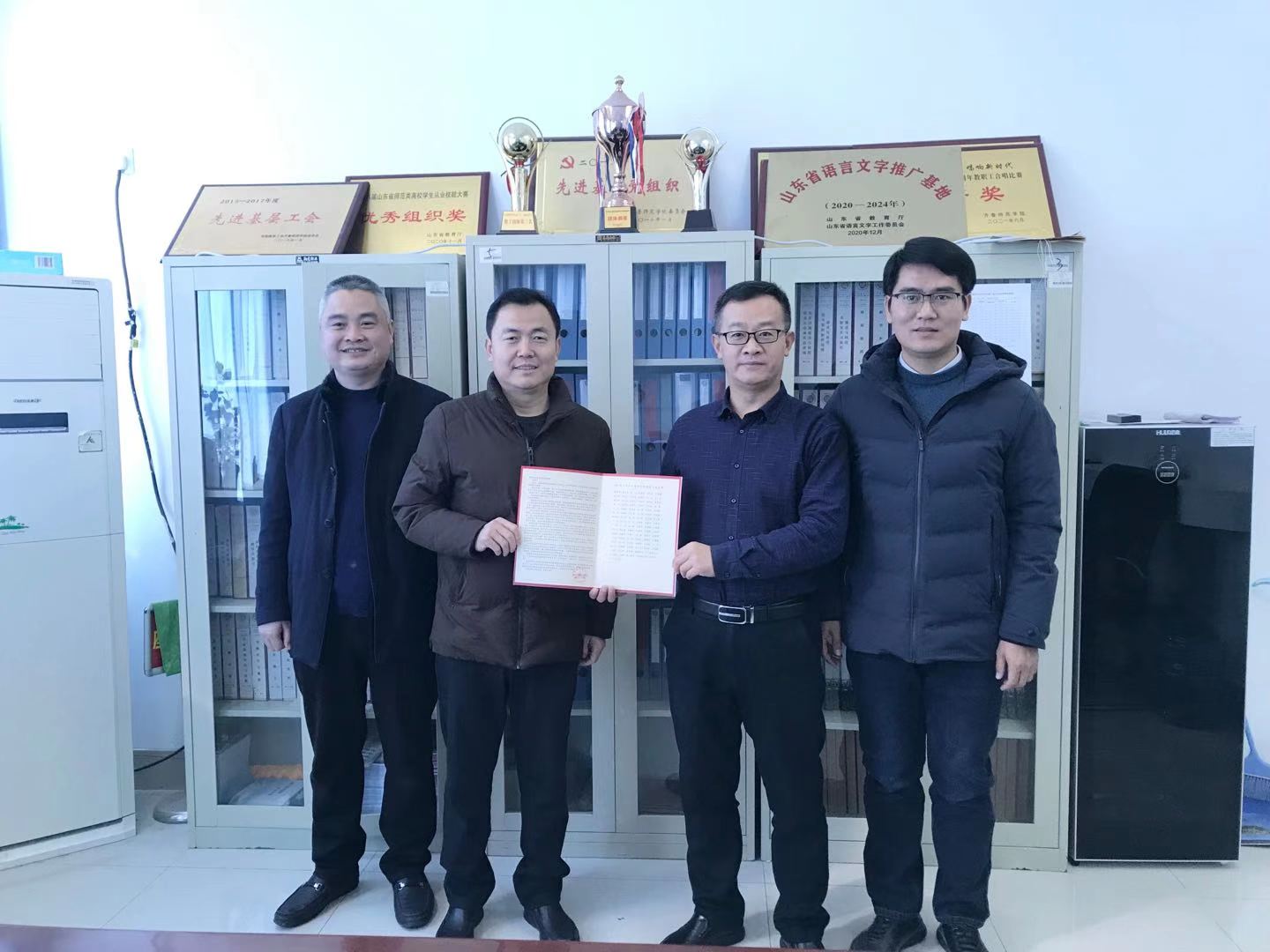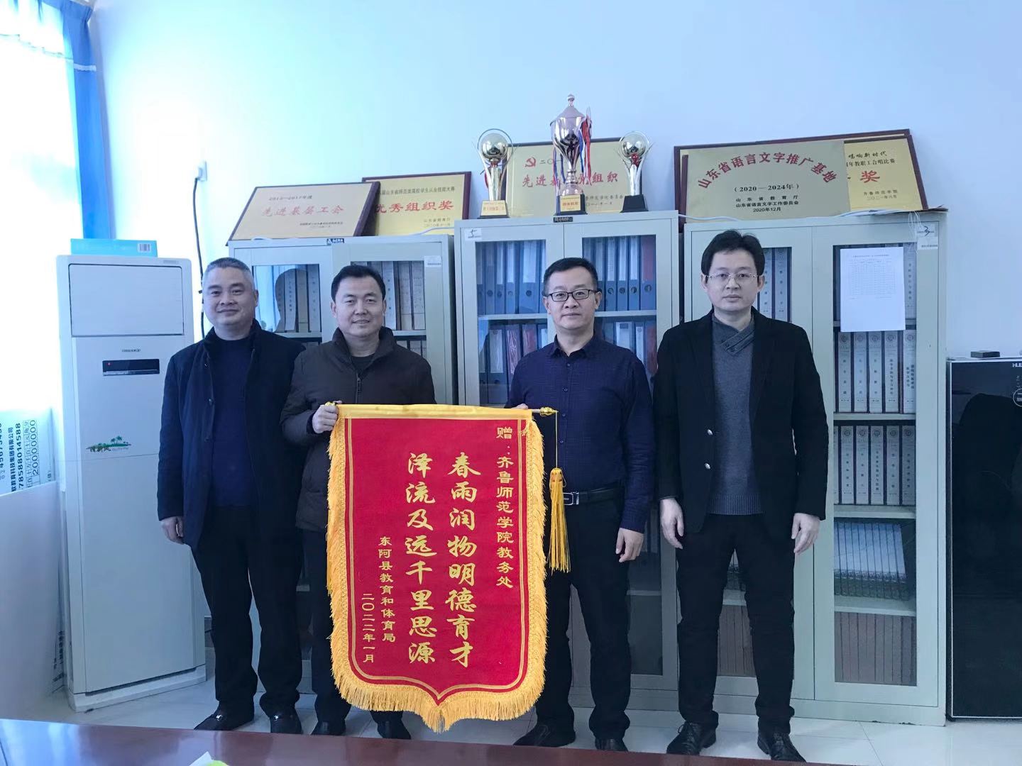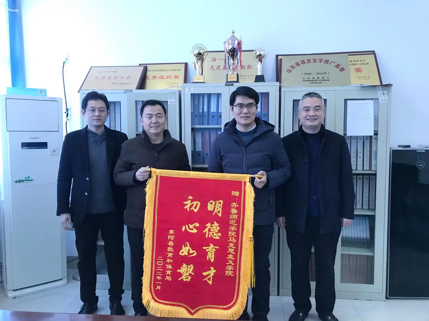2022年1月13日上午,东阿县实验中学校长陈忠伟、实验小学校长王士军代表东阿县教体局向威尼斯官网赠送锦旗及感谢信,教务处处长孙洪兆、马克思主义学院院长赵立峰接受了锦旗及感谢信,并与他们进行了亲切座谈。
