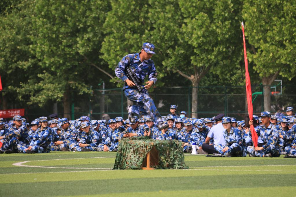歌声嘹亮,国旗飘扬,大会在雄壮的国歌声中拉开帷幕。学生军训团20个方阵依次经过主席台,接受检阅。日常养成训练军容严整、军姿飒爽、动作规范;卧倒、滚翻、搜索前进等单兵技能,掩护配合、攻防兼备的班组战术,不仅是对同学们自身技能的训练,更是对团队配合磨练和血性意志的锤炼;拳打、脚踢、摔打、夺刀、夺枪……“军体拳”培养了同学们阳刚气质、顽强意志、强健体魄和过人胆识,是对矢志不渝的战斗精神和对国家忠诚信念的体现。