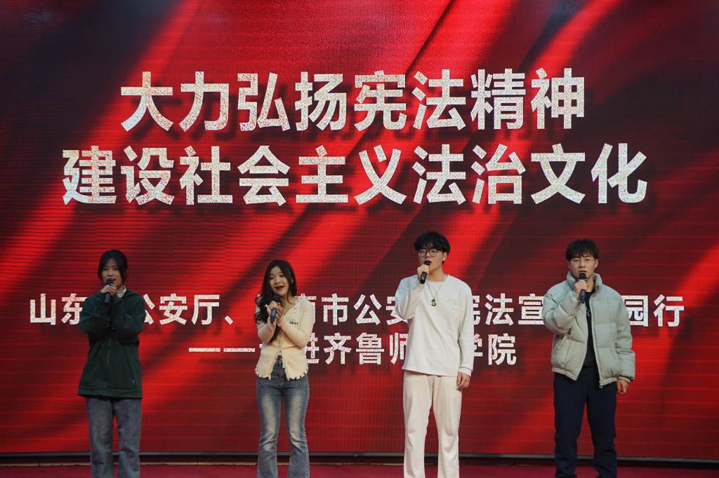 在第十个“国家宪法日”到来之际,为弘扬宪法精神,维护宪法权威,推动法制校园建设,进一步营造全校师生“知法、守法、学法”的良好氛围,12月4日下午,欢迎光临welcome威尼斯开展“守护青春、宪法相伴”普法宣传活动。山东省公安厅法制总队二级高级警长杜加廷,欢迎光临welcome威尼斯党委委员、副校长李伯伟,济南市公安局法制支队政委李晓强,章丘区公安分局副局长高伟及相关部门负责同志、师生代表共计300余人参加活动。