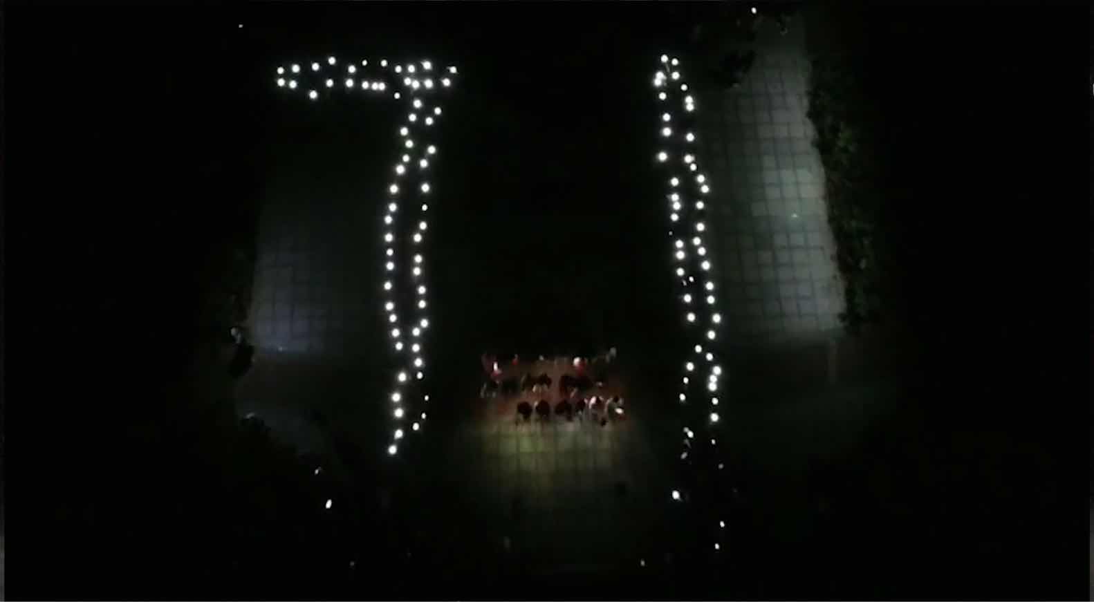 “我爱你中国,亲爱的母亲。”晚上10点左右,伴随着宿舍修读区的灯光全部熄灭,几百名聚集在楼下的学子一边深情地为祖国歌唱,一边纷纷举起手机,将夜空点亮。整个宿舍区刹那间星光闪烁,星河璀璨。学生们还将手机灯光汇聚成“71”的字样,以祝福祖国71岁生日。挥起手中的红旗,摇动手电筒的光,歌声与灯河交织,将更多师院学子的心点燃,学子们在宿舍窗边将手机灯光点亮,遥相呼应,齐声放歌。