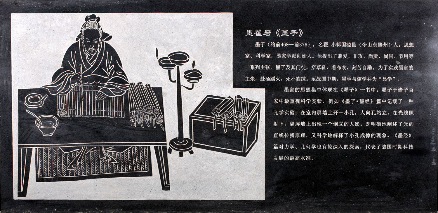 墨子的主张主要体现在《墨子》一书中,是墨家的经典著作。《墨子》书十五卷、五十三篇,所涉内容极为广泛,《墨子》中所蕴含的科技思想是我国古代科技思想渊源中最优秀的代表。其中《墨经》篇是《墨子》书中的重要部分,《墨经》不仅有逻辑学方面内容,还有8条论述几何光学的知识,尤其是它阐述了影、小孔成像、平面镜、凹面镜、凸面镜成像,还说明了焦距和物体成像的关系,这些比古希腊欧几里德的光学记载早百余年,代表了战国时期科技发展的最高水平。